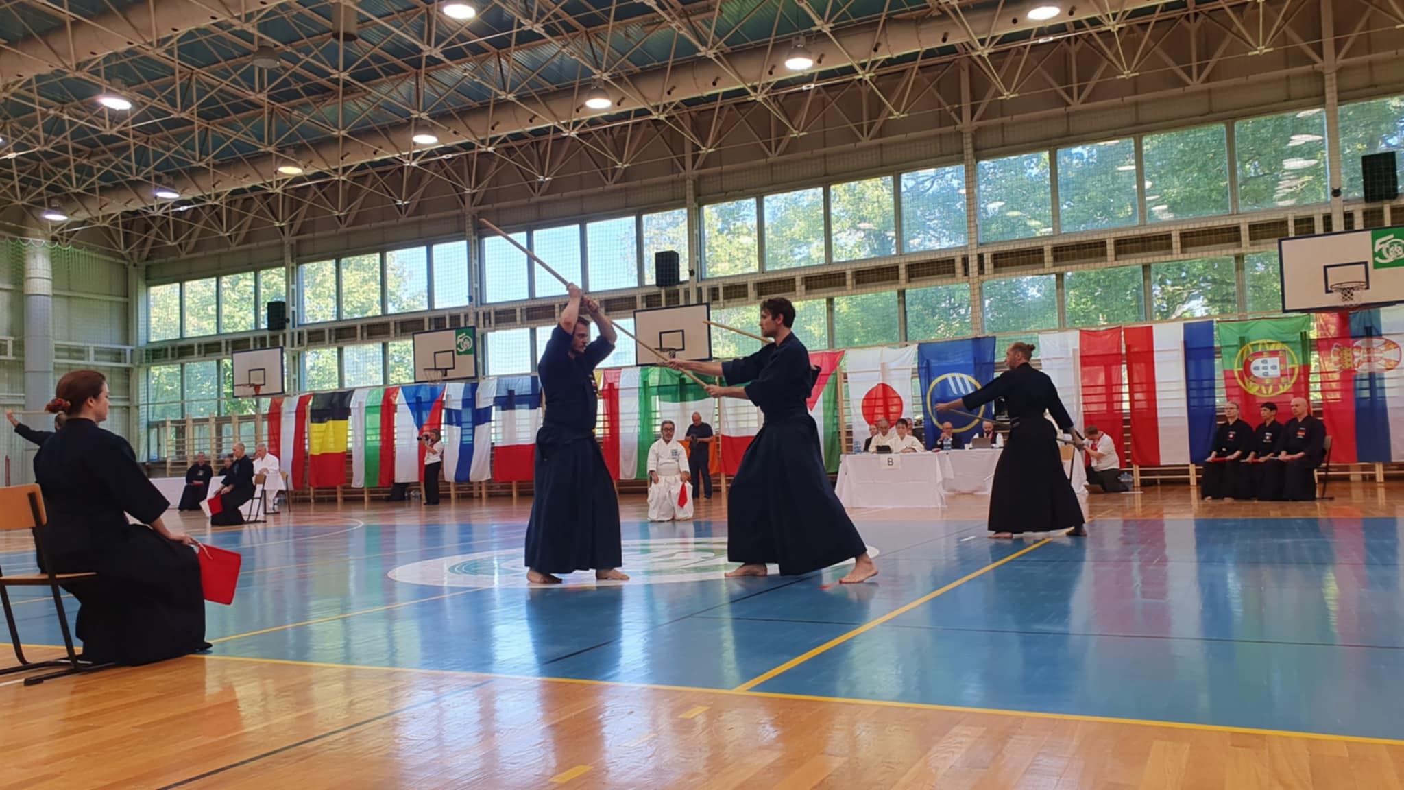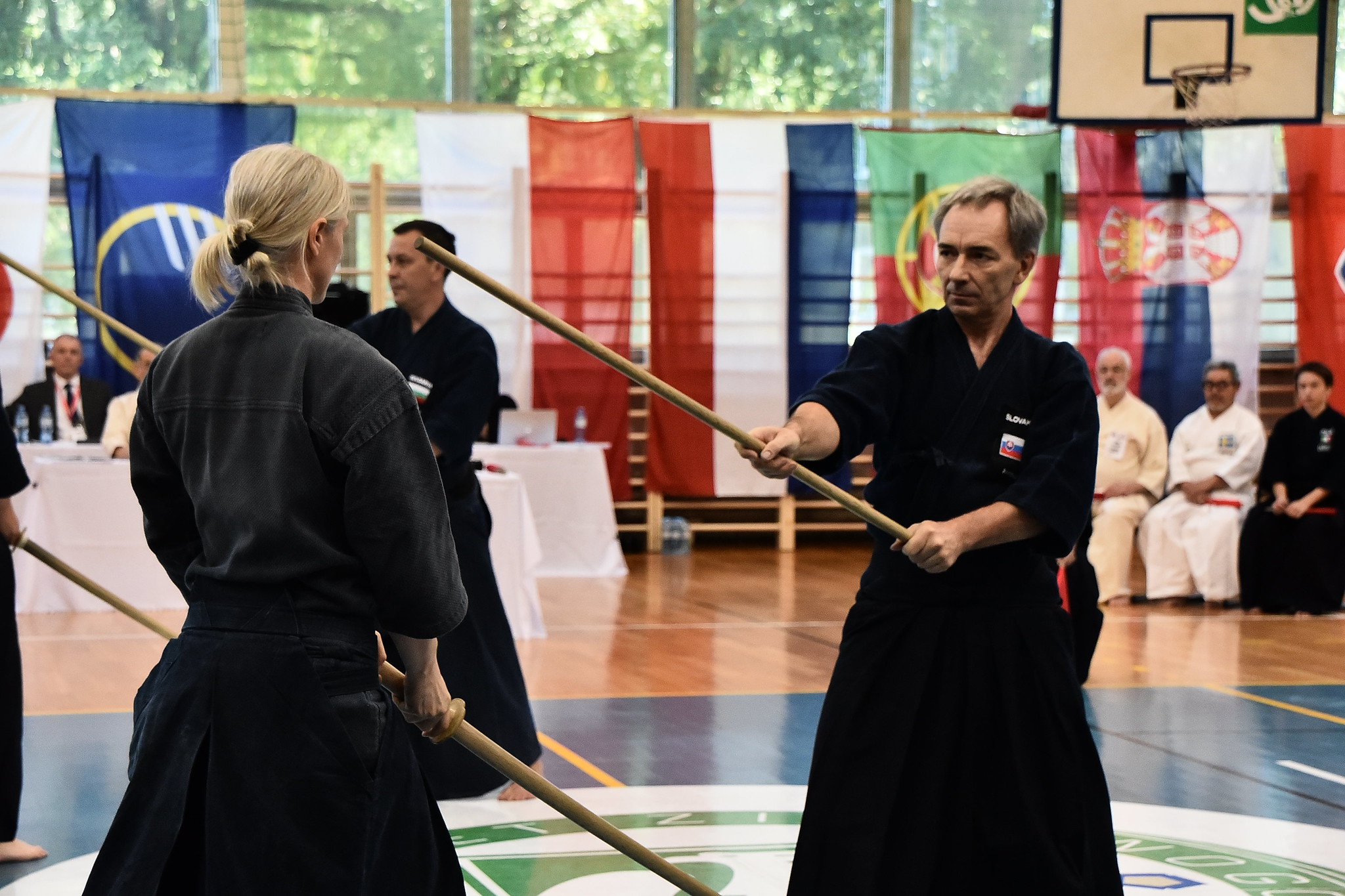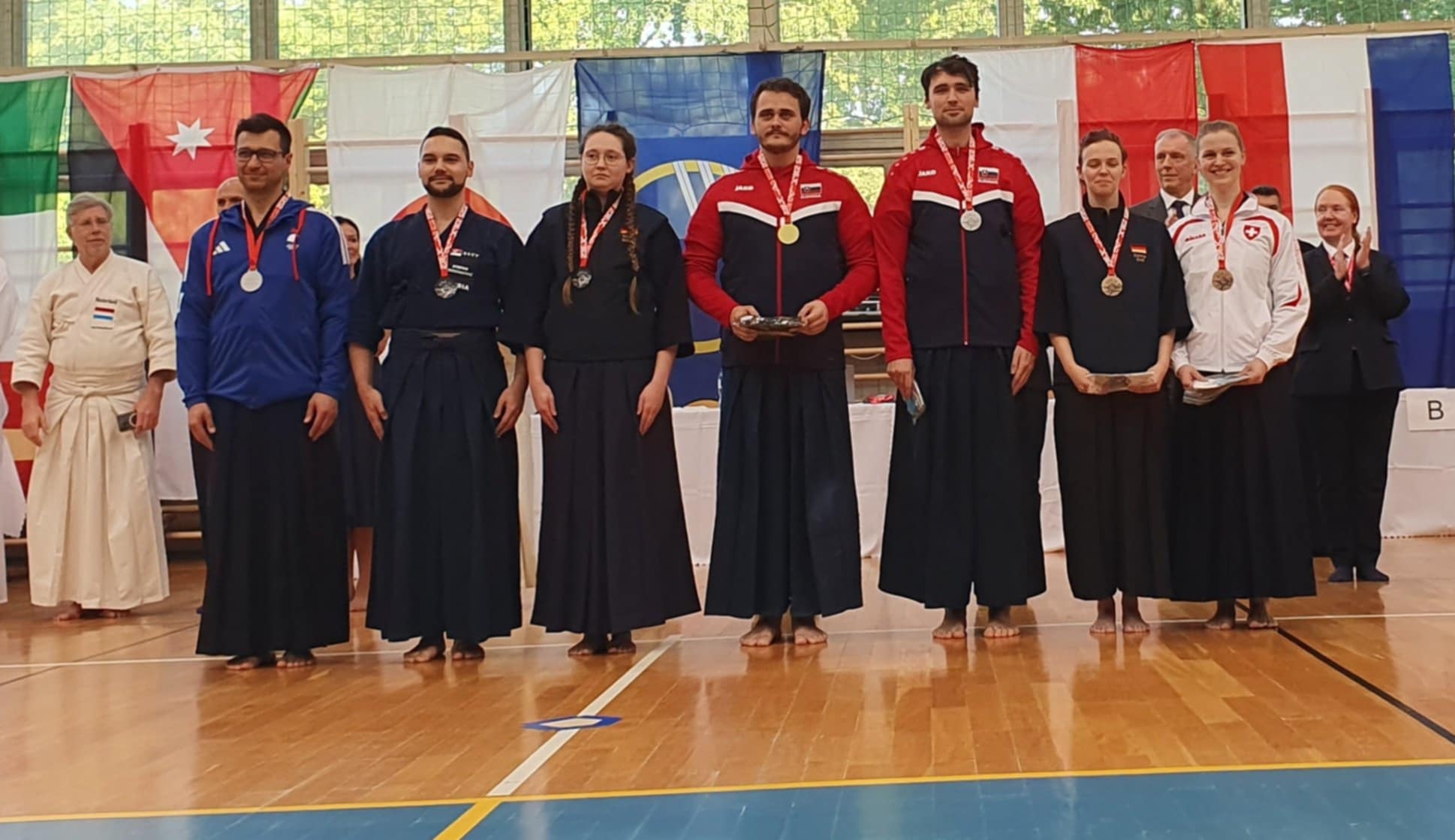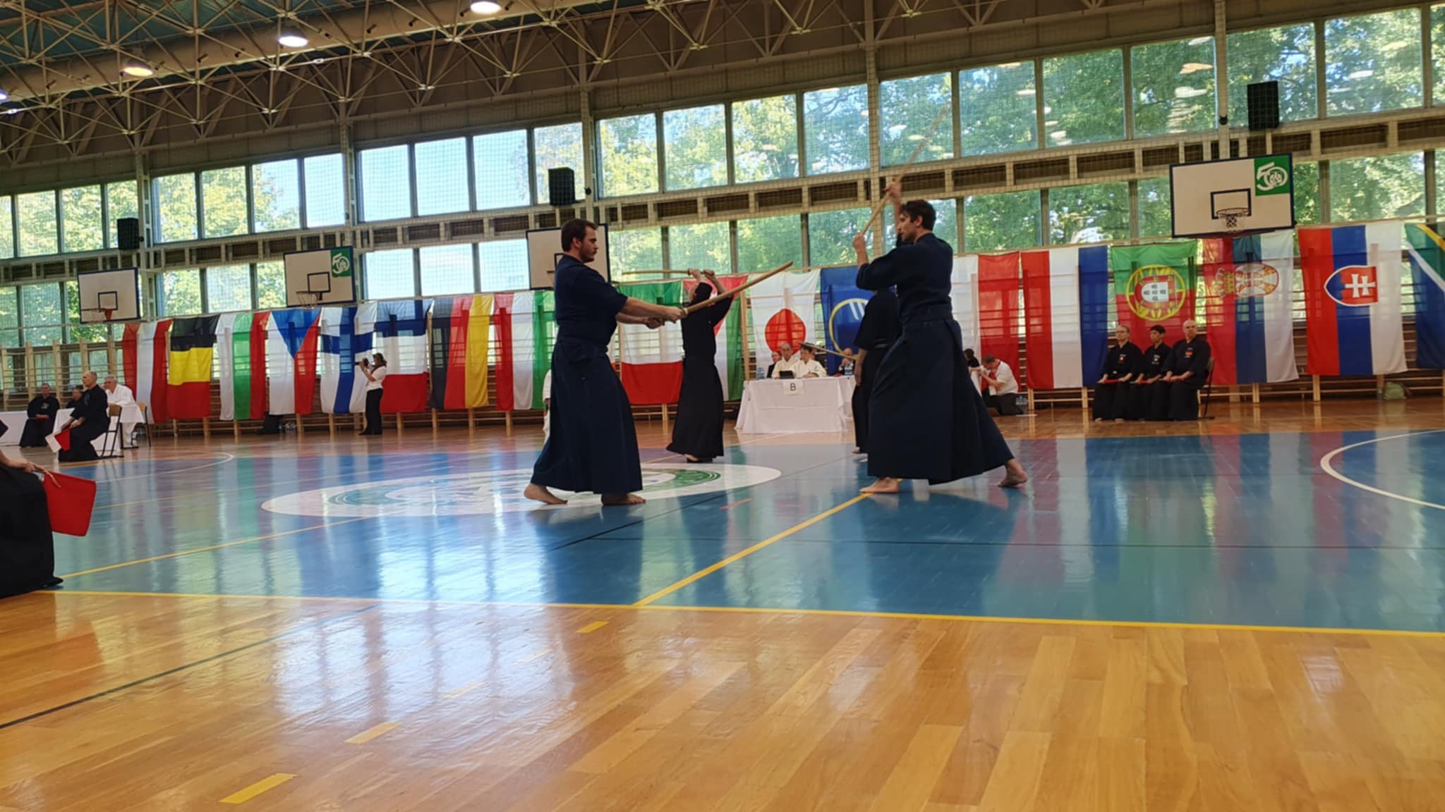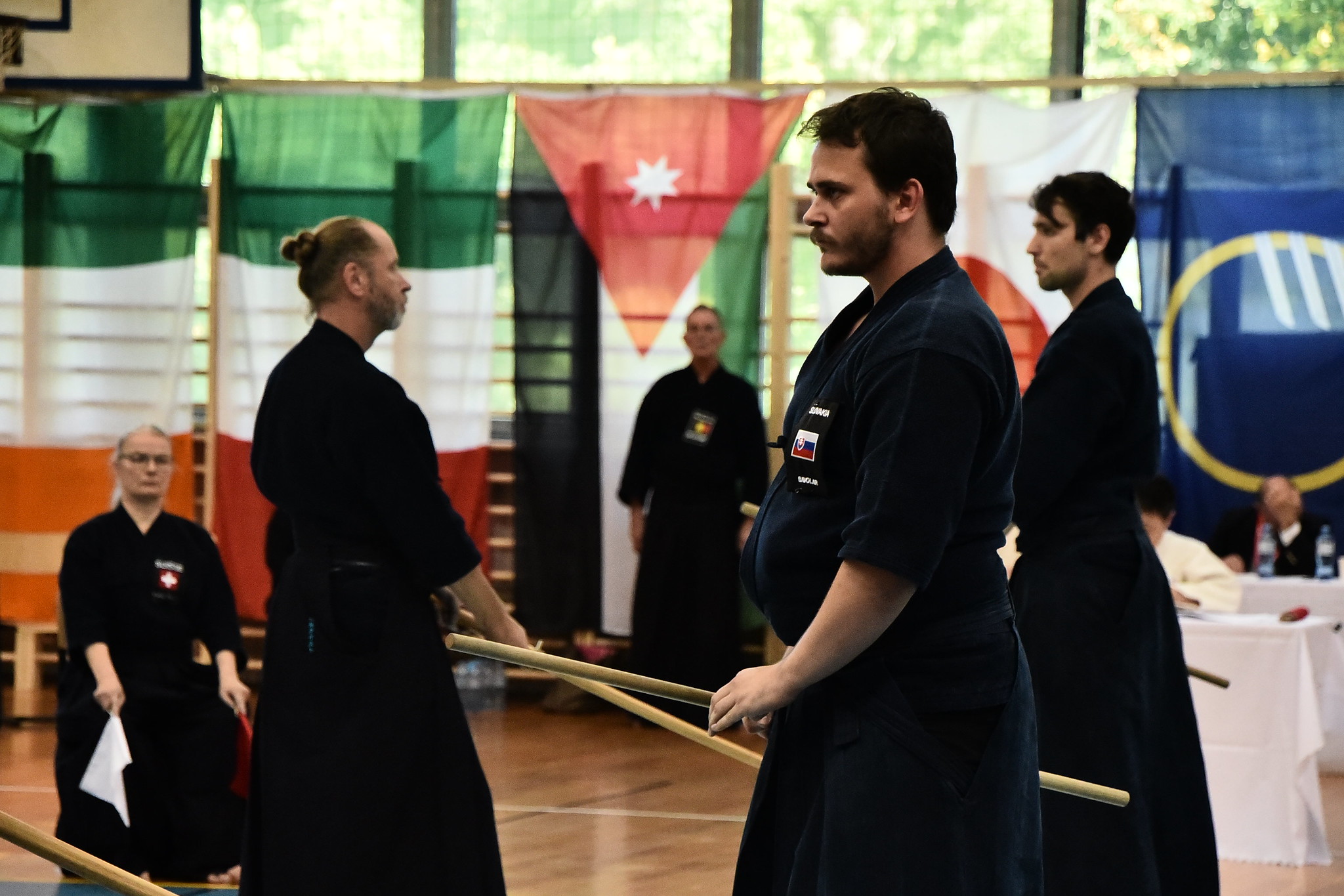 After the rokudan category finished in the morning, our guys Matúš and Marek stepped onto the shiaijo in the mudan division. They fought like seasoned veterans, each winning their group and advancing from first place. Adriana and Marián mirrored their success, all four advanced to the next rounds. The Slovak flag was starting to pop up quite a lot on the scoreboard.