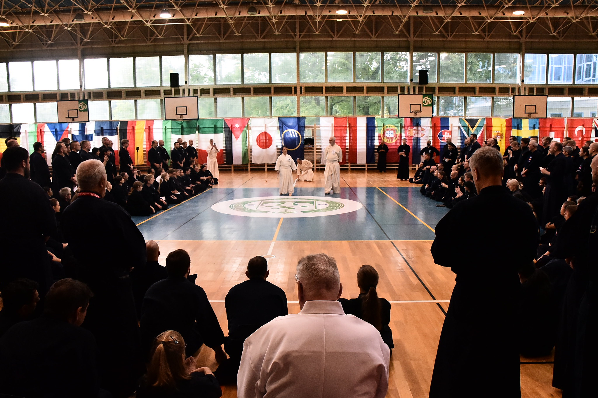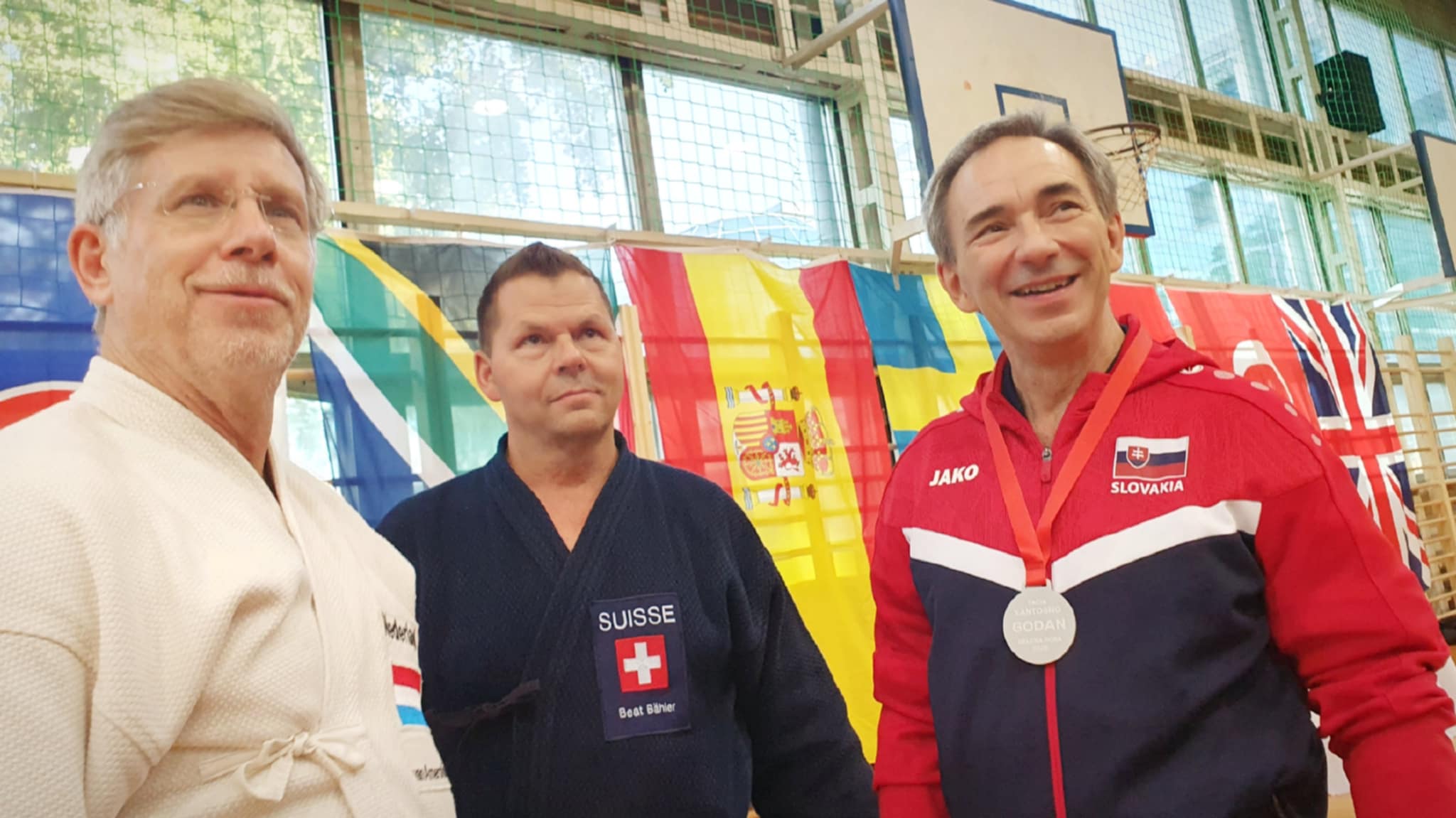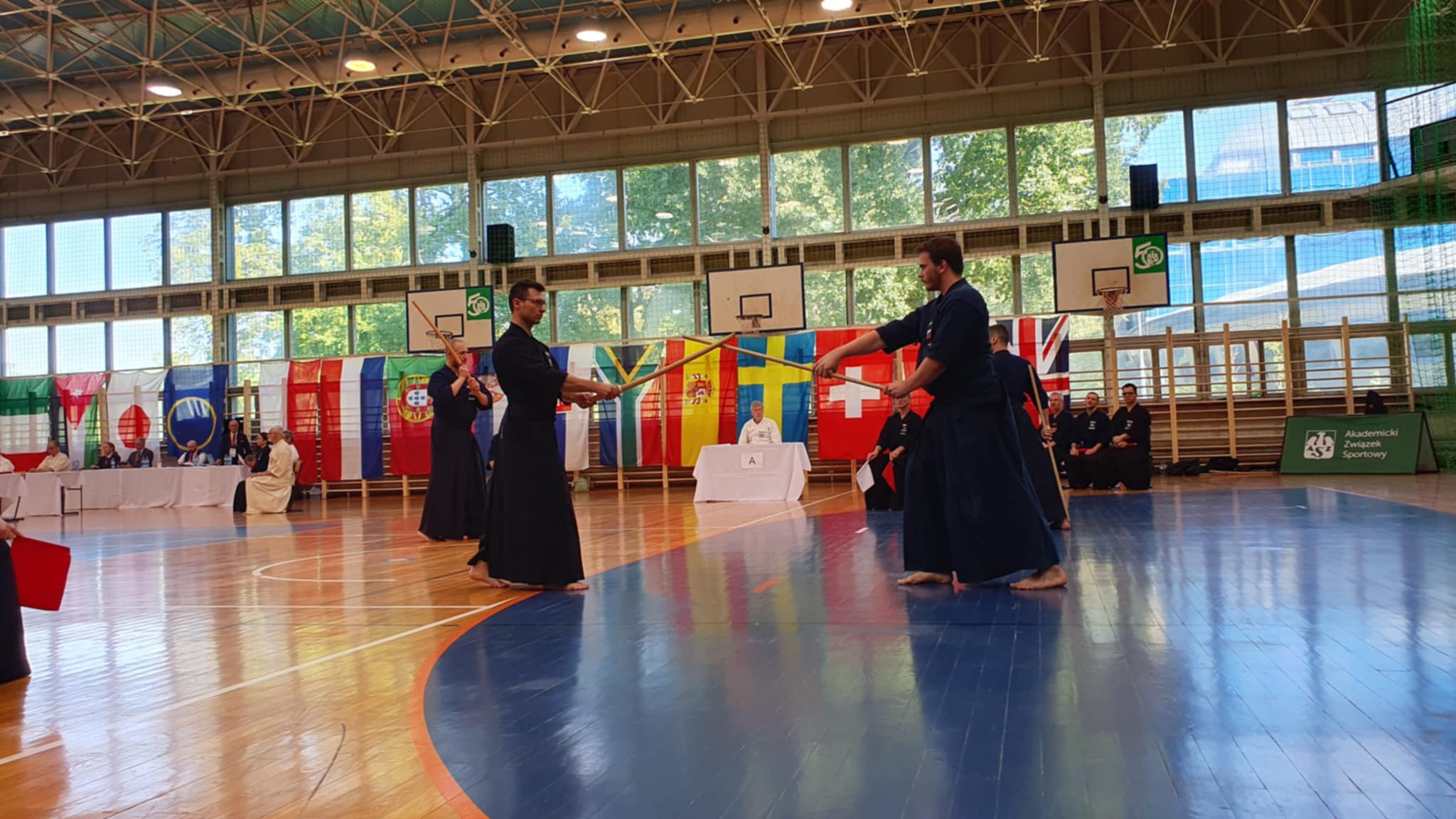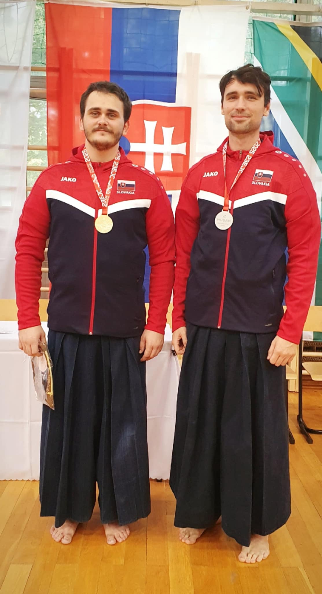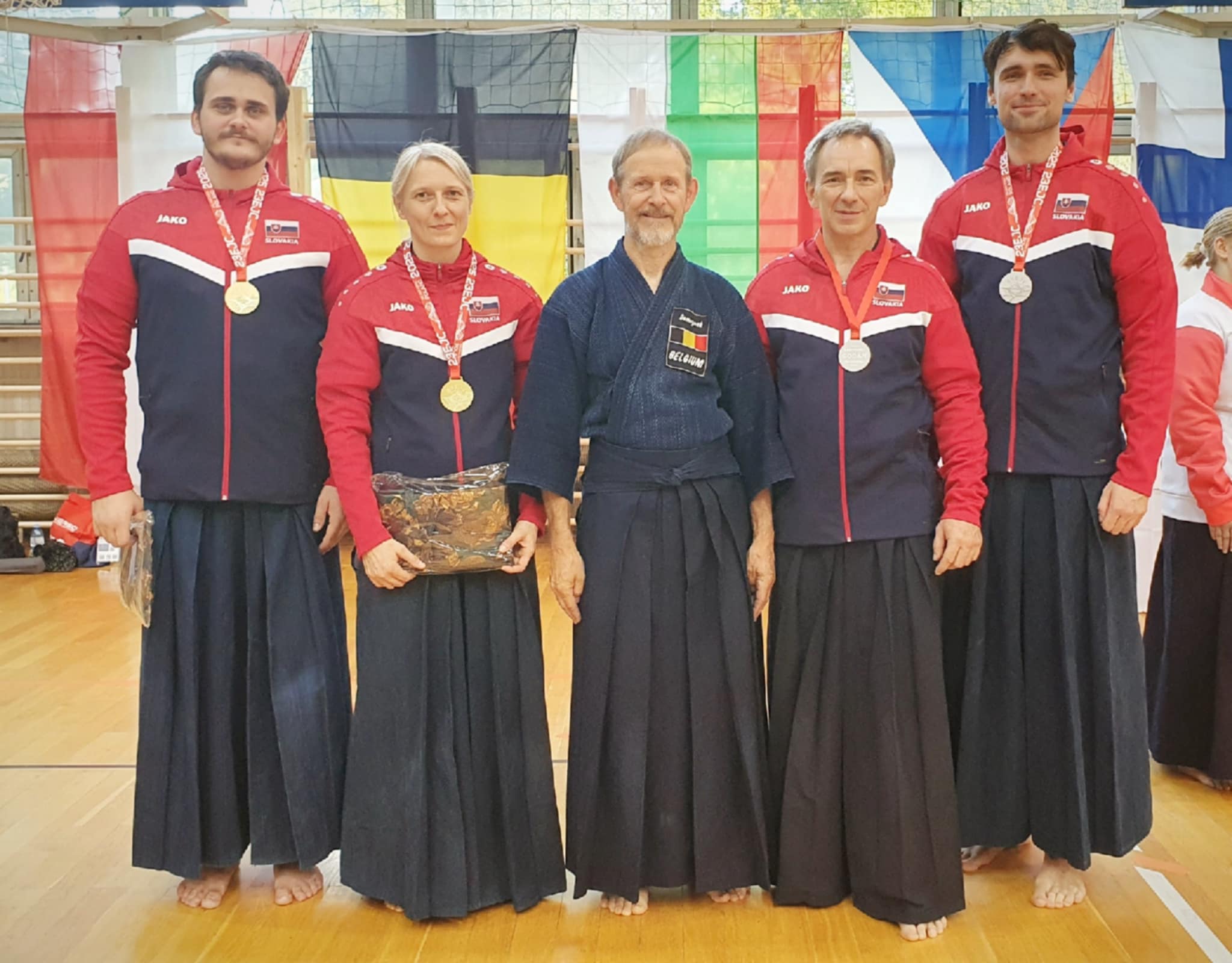 After the rokudan category finished in the morning, our guys Matúš and Marek stepped onto the shiaijo in the mudan division. They fought like seasoned veterans, each winning their group and advancing from first place. Adriana and Marián mirrored their success, all four advanced to the next rounds. The Slovak flag was starting to pop up quite a lot on the scoreboard.